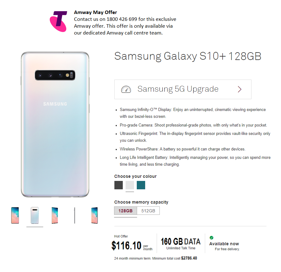 Amway May Offer - Samsung Galaxy S10+ 128GB -$116.10 per month, plus unlimited talk time. Contact Telstra on 1800 426 699 for this exclusive Amway offer. This offer is only available via our dedicated Amway/Telstra team. Please click here to read more about this offer.